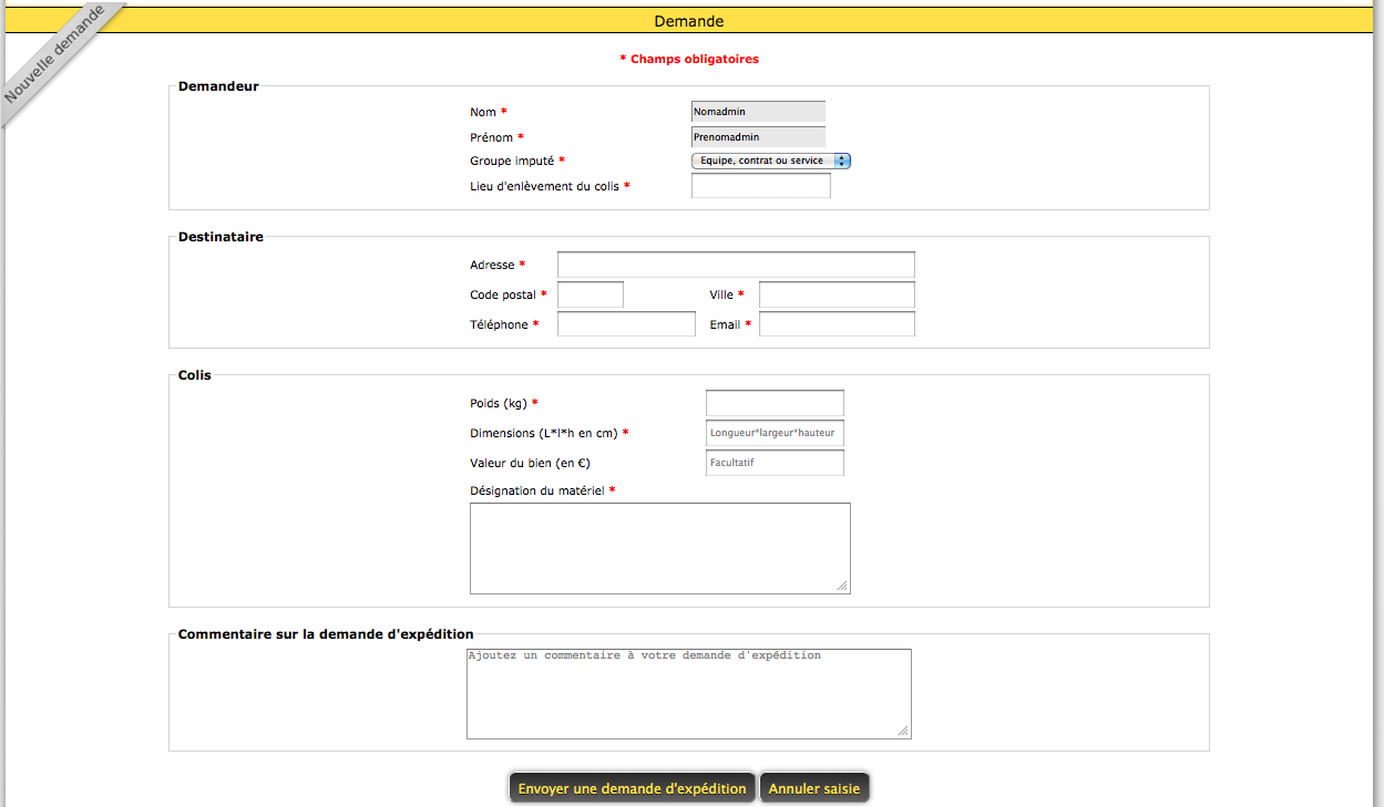 NB : Des emails sont envoyés aux personnes concernées (demandeur et gestionnaires) lors de la demande, l'annulation ou de la validation d'une demande d'expédition.II) Guide utilisateur