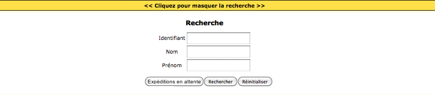 Le lien "<< Cliquez pour afficher la recherche >>" dévoile la partie de l'interface graphique contenant la fonctionnalité de recherche. Chaque utilisateur peut retrouver ses expéditions par numéro de demande, par nom ou par prénim du demandeur.