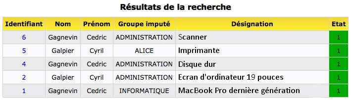 Le résultat de la recherche se présente sous forme de liste (voir ci-dessous). Pour accèder au détail d'une demande d'expédition, il faut cliquer sur le numéro d'identifiant correspondant.