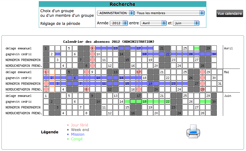 Le module PLANNING du portail PhpMyLab permet de visualiser les congés et les missions depuis un poste connecté à Internet. |